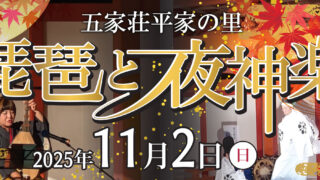 イベント 2025.11.2 琵琶と夜神楽@平家の里 熊本県八代市泉町五家荘平家の里 琵琶と夜神楽日時 2025年11月2日(日)10:00~19:00場所 五家荘平家の里熊本県八代市泉町樅木160-1TEL0965-67-5372演奏・上演スケジュール10:00~ 中国琵琶 (潮谷文芳) 1... 2025.10.05 イベント