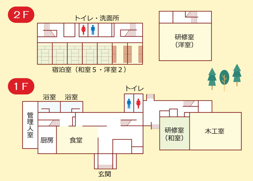 大自然に囲まれた標高900mの高地にあり、研修室、木工室、大浴場、屋根付きのキャンプファイヤ棟なども完備。木の温もりを感じながら、部活動の練習や勉強合宿、学校・企業の研修、ご家族やグループでの滞在にぜひご利用下さい。